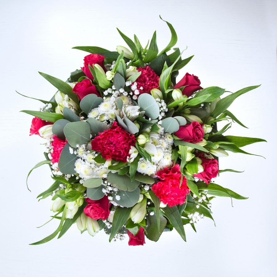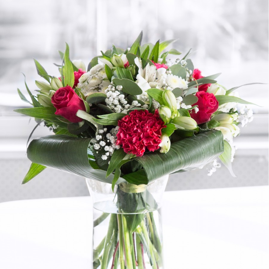 Our Vibrant Elegance Bouquet offers a breathtaking escape into the realm of refined floral artistry. Immerse yourself in the invigorating mix of crisp white chrysanthemums, airy gypsophila, deep red roses, and charming carnations. Intertwined gracefully with pure white alstroemeria and aspidistra leaves, this arrangement radiates unparalleled beauty and sophisticated design.