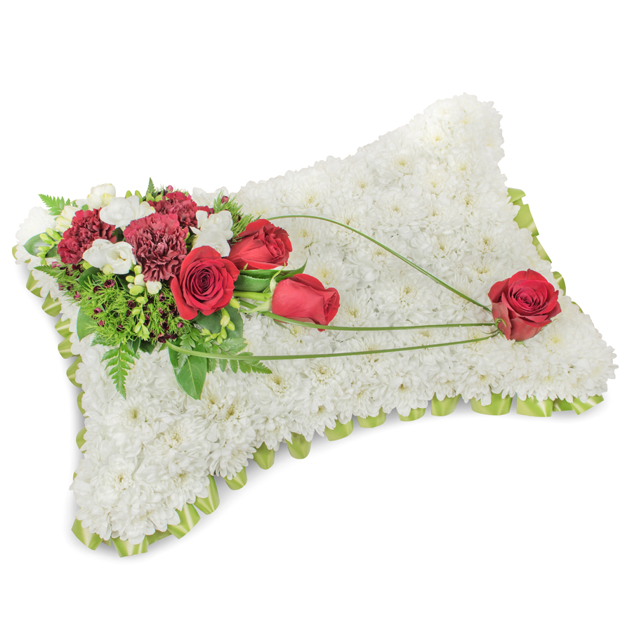 Convey your sincere sympathy with our delicate and unique flower bouquet. This arrangement features white chrysanthemums, red roses, white freesias, dark red carnations, dianthus, and bear grass, thoughtfully arranged to express your heartfelt condolences.